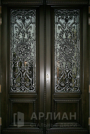 Входная коричневая дверь в частный дом со стеклопакетом и ковкой №11